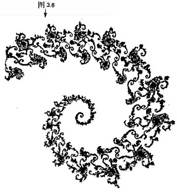 在这个结构的许多地方刚好有两个涡旋碰到一起。让我们把放大倍数增加30倍左右,以考察其中一处(在图3.5中的标志“图3.6”的下面)。请注意,我们是否发现了中间有个奇怪但非常熟悉的对象?再放大6倍左右(图3.7)就能揭示出一个怪物的小婴儿——它几乎和我们考察过的整个结构完全一样!如果我们细看,就会发现从它那里出发的细丝和从主结构那里出来的略有差别。它们扭曲并延伸到更远得多的距离去。然而比细小结构本身几乎和它的上一代毫无差别,甚至在非常相应的地方拥有自己的后代。如果我们还进一步放大,就能继续考察这些东西。孙子们又非常类似于它们的共同祖先——人们很容易相信,这些现象会无限地延续下去。只要不断地提高我们感觉仪器的放大倍数,就可随心所欲地探索托伯列南的奇异世界。我们发现了无穷尽的变化:没有两个区域是完全相像的——但是我们很快就会习惯于存在的一些普遍的风格。而熟知的类甲虫的结构以越来越小的尺度重新出现。每一回它的附近的细丝结构都和早先看到的不同,并以不可置信的复杂的美妙的新景象呈现在我们的面前。