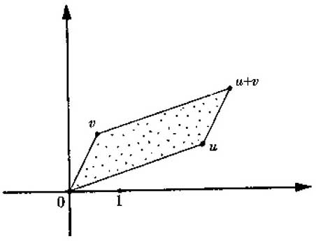 现在复数的加法和乘法的基本代数运算具有清楚的几何意义。首先考虑加法。假设u和v为两个复数,并按照上述的方案表示在亚根平面上。则它们的和u+v就由这两点的“向量和”来表示;也就是说,它处于由u, v和原点0构成的平行四边形的另一顶点。我们不难看出,由这种构造(图3.10)可以得到