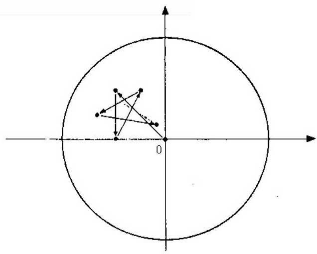 图3.12 如果在亚根平面上存在包括序列所有点的某一个固定圆周,则该序列是有界的(这个特殊的迭代从0开始并且C=-1/2+1/2)i