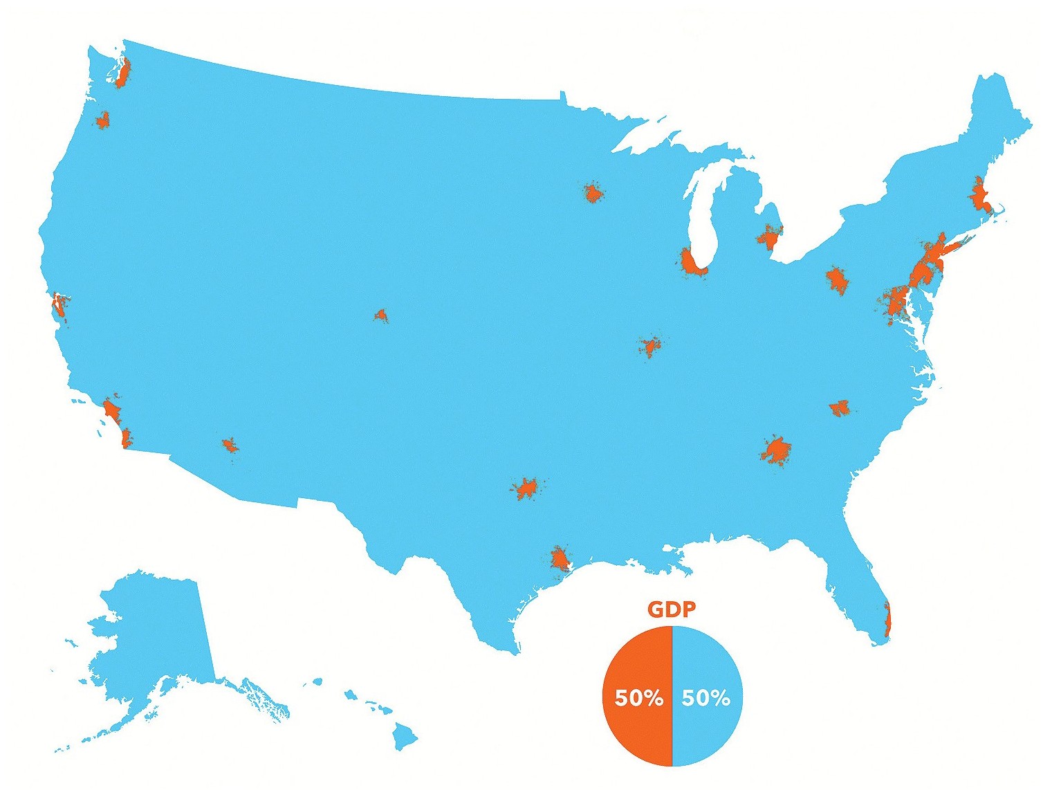 橙色的区域占有美国经济半壁江山,但在人均GDP的意义上却实现了“平衡发展”。(图片来源:http://gizmodo.com/u-s-economic-activity-split-in-half-and-mapped-1524966661)