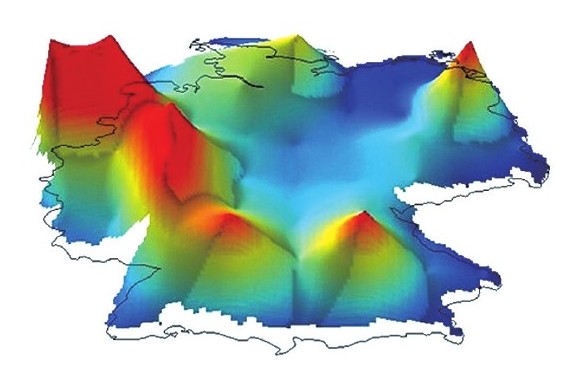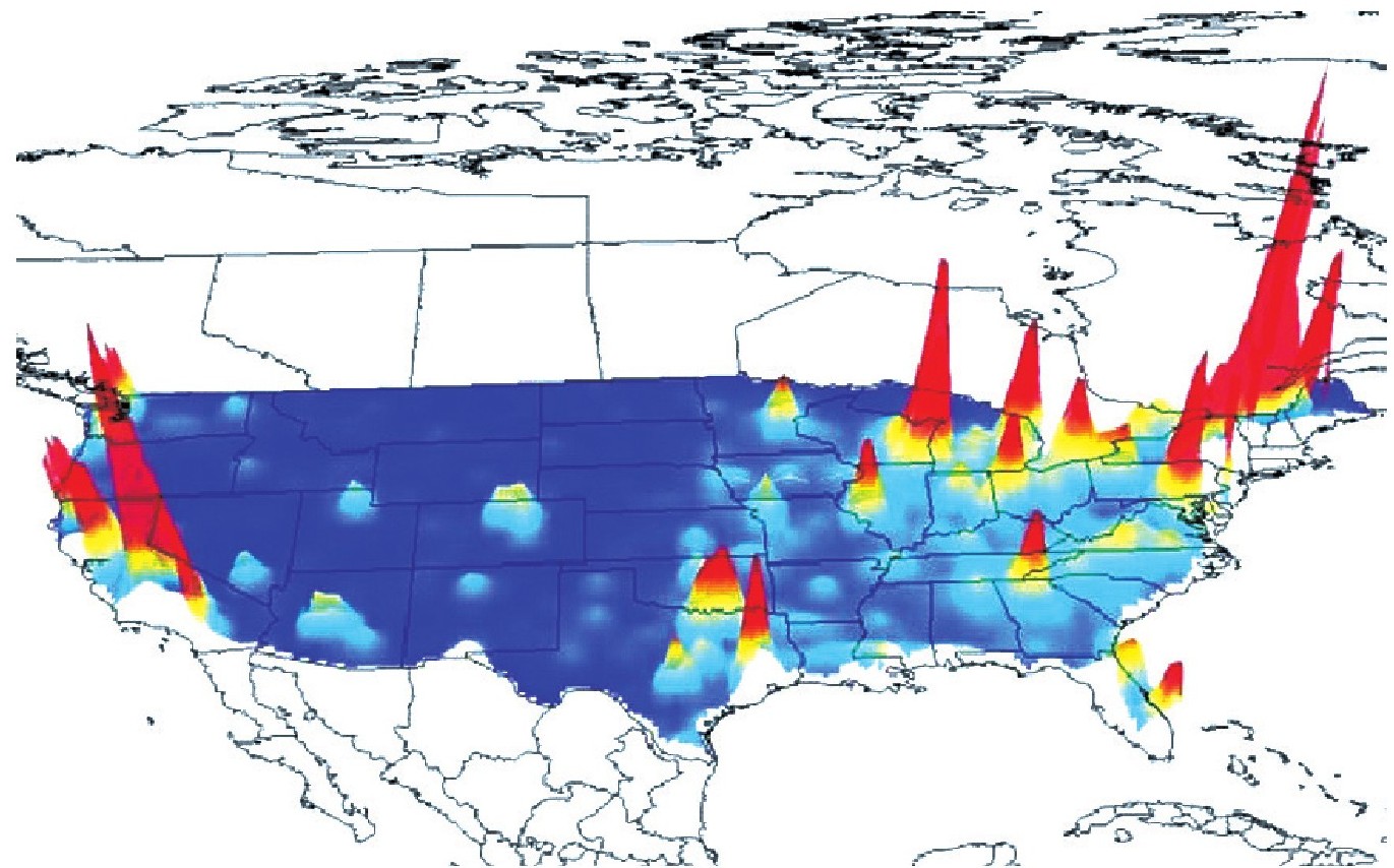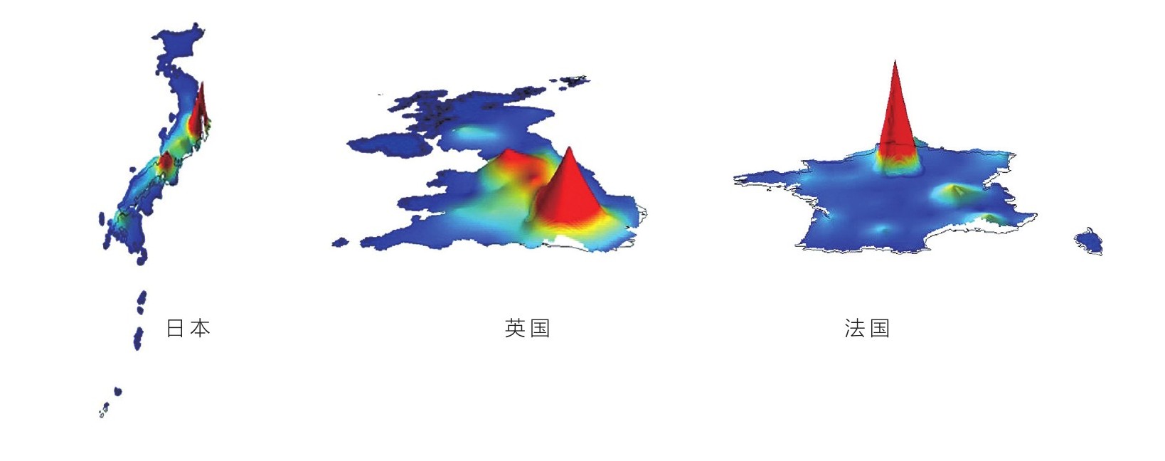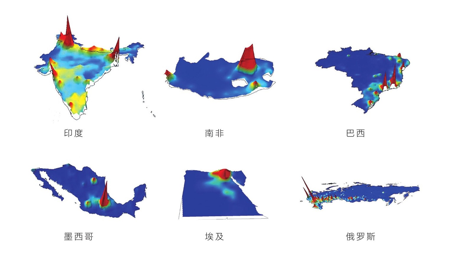 图中锥形的高度表示每单位面积上的GDP产出。这是美国经济高度集聚在少数地区的另一种表述形式,单位土地面积上的产出,不同地区之间差异巨大。(图7-12来源:http://gecon.yale.edu/country-listing)
