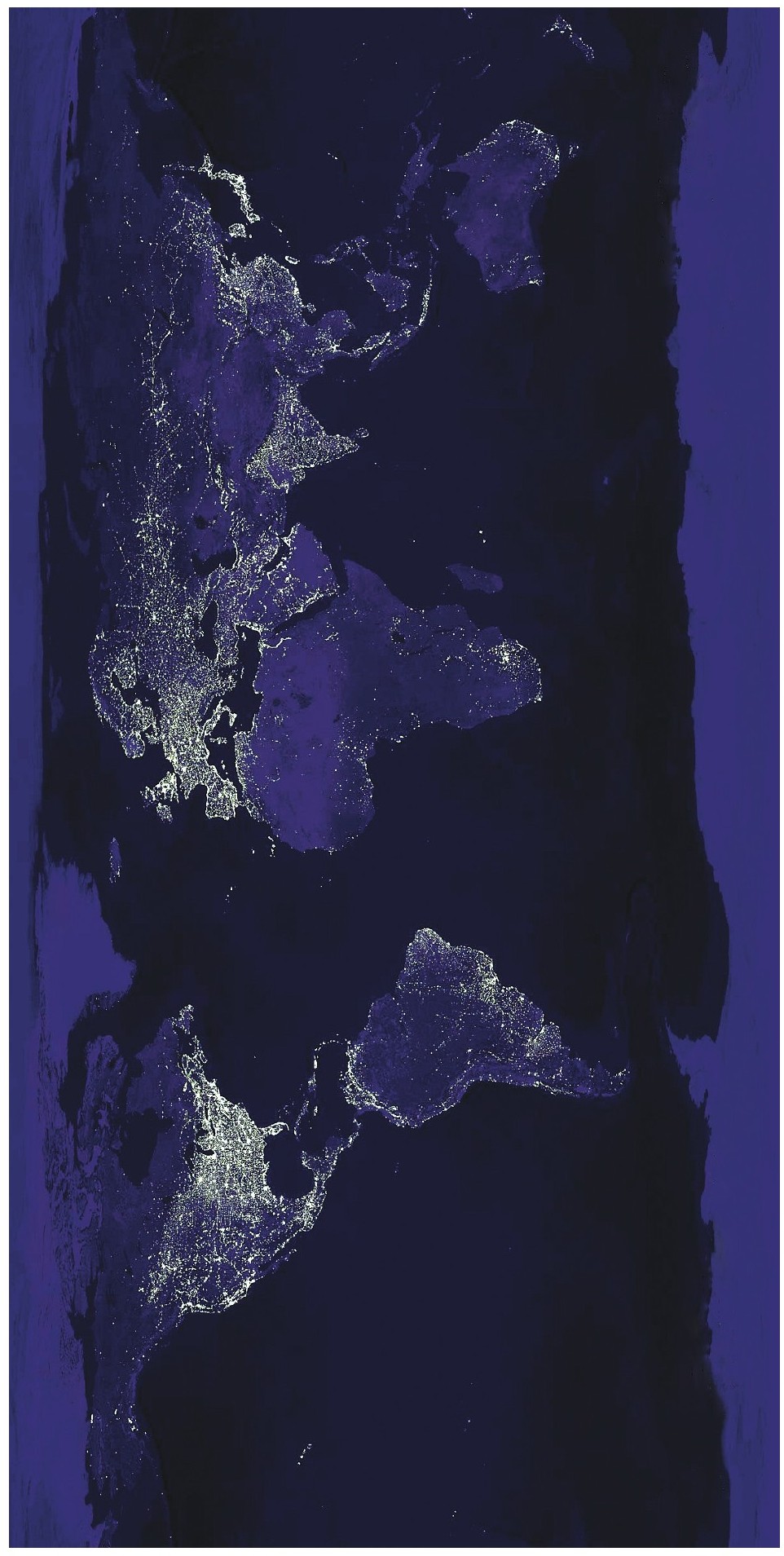 在国家间,亮度的差异主要取决于经济发展水平;在国家内部,亮度的差异主要取决于人口密度。由图可见,全球人口分布是非常不均匀的。(图片来源:美国国家航空航天局网站拍摄时间:2002年8月11日)