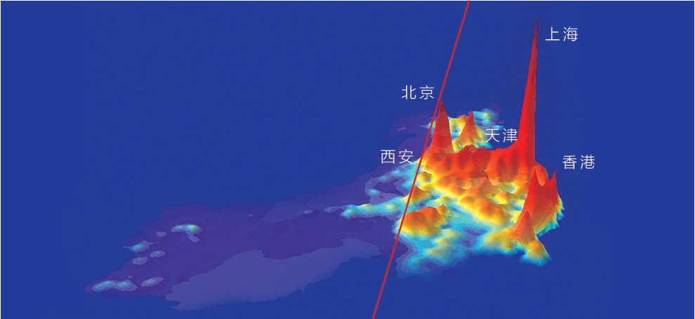 根据美国的卫星数据制作而成的世界夜晚灯光地图(见书前彩图1),从世界范围来看,灯光亮度高的地方,总是集中在全球陆地的一小部分。从图上可以看到,在国家与国家之间,灯光亮度基本上取决于这个国家的经济发展水平,对于这一点,我们的邻居韩国和朝鲜对比非常强烈。而如果看一个国家内部,例如看美国,夜晚灯光亮度主要取决于经济和人口的集中程度,人口高度集中的东海岸连成片的都市带和西海岸的狭长地带比较亮。同样,欧洲比较亮的地方是西欧的一些大城市附近。