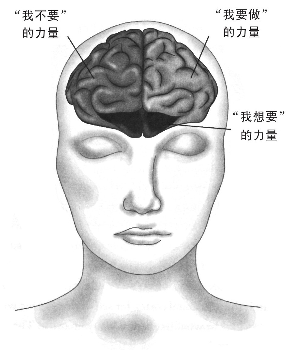 前额皮质并不是挤成一团的灰质,而是分成了三个区域,分管“我要做”“我不要”和“我想要”三种力量(见图1-1)。前额皮质的左边区域负责“我要做”的力量。它能帮你处理枯燥、困难或充满压力的工作。比如,当你想冲个澡的时候,它会让你继续待在跑步机上。右边的区域则控制“我不要”的力量。它能克制你的一时冲动。比如,你开车时没有看短信,而是盯着前方的路面,就是这个区域的功劳。以上两个区域一同控制你“做什么”。