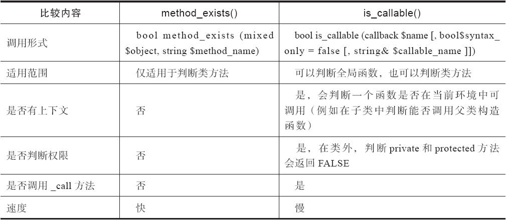 下面我们举一个例子,来说明method_exists()和is_callable()函数的区别。如代码清单1-26所示: