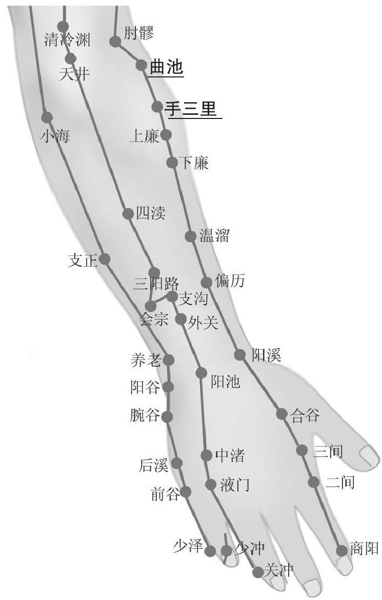 6.按揉手三里。用一只手的拇指指腹按在患侧手三里穴处,其余四指附在穴位对侧,适当用力按揉30~60秒,具有理气和胃、通络止痛的功效。
