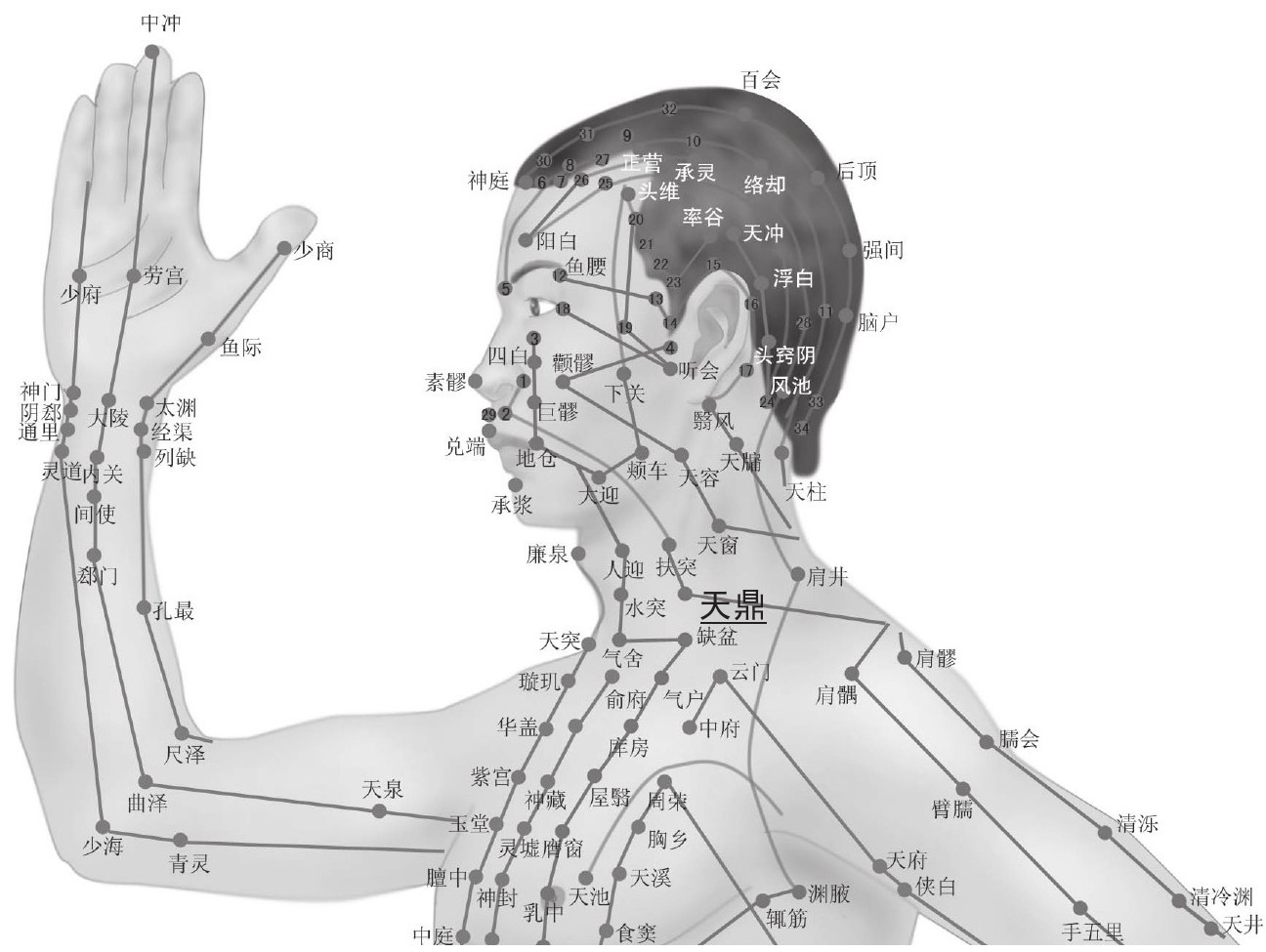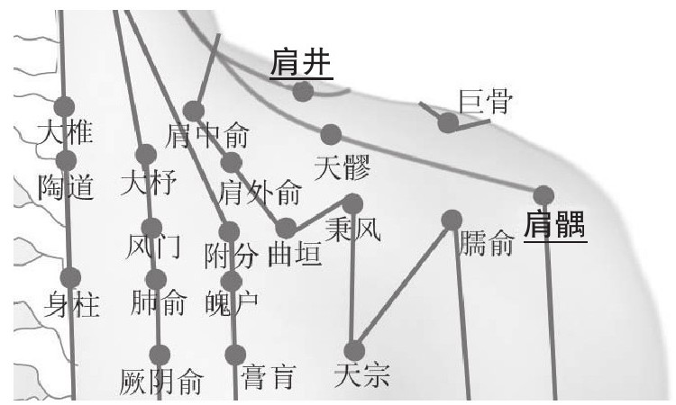 4.压天鼎、肩中俞法。患者取坐位,家人站在前面,一手拇指按压伤侧天鼎穴,另一手多指轻扶头部腱侧将其向伤侧微屈,持续半分钟;然后,一手按压侧肩部,另一手拇指端压伤侧肩中俞穴30秒。这种方法常用于疼痛剧烈的情况。