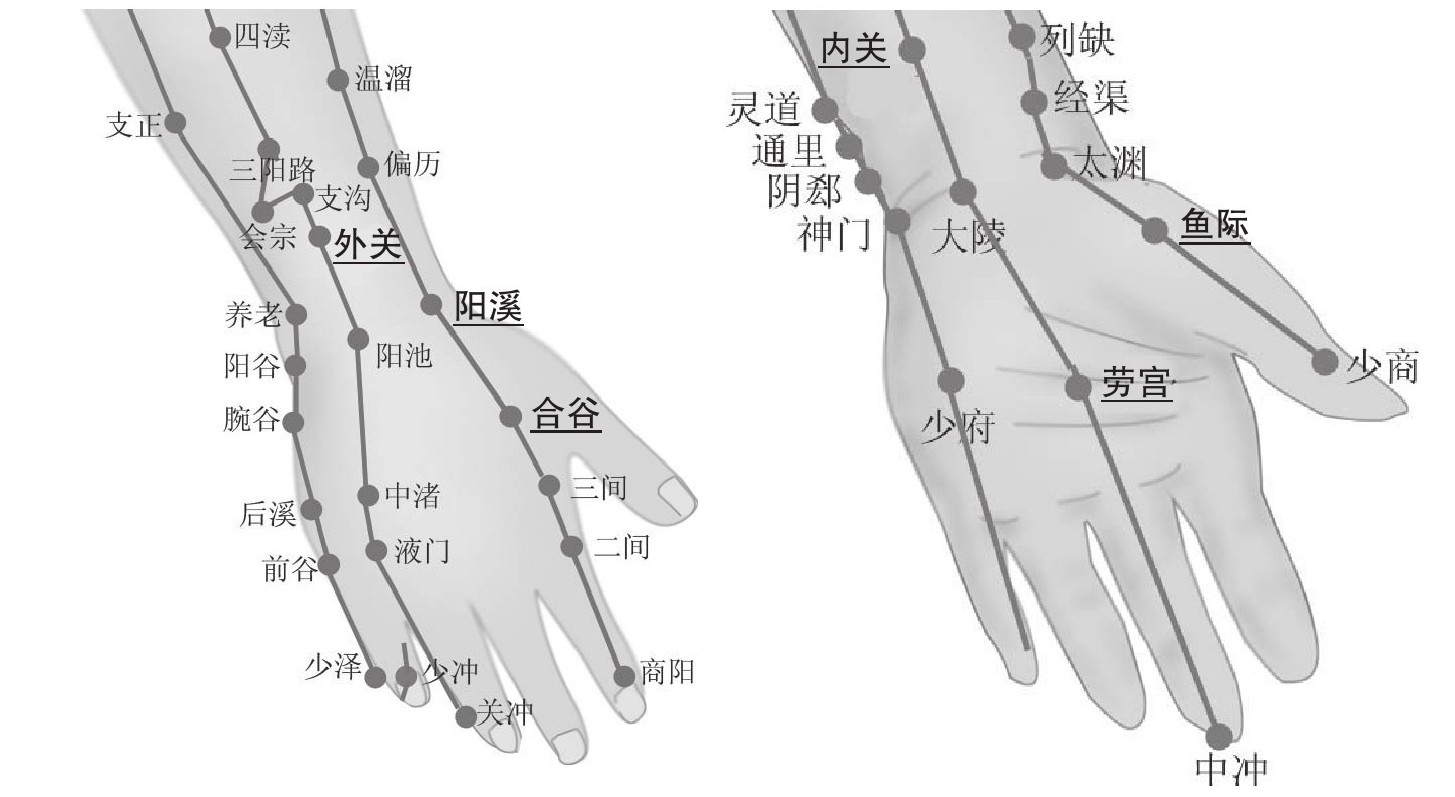4.在患肢痛点,以及内关、外关、阳溪、鱼际、合谷、劳宫等穴施用点穴法,动作轻柔,每次1分钟即可。