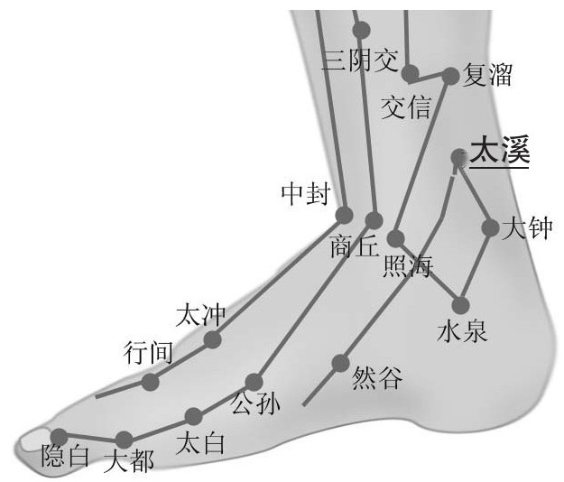 1.取穴。主穴为阿是穴,配穴为太溪穴,艾灸方法为隔药灸、隔饼灸,可任选其一。