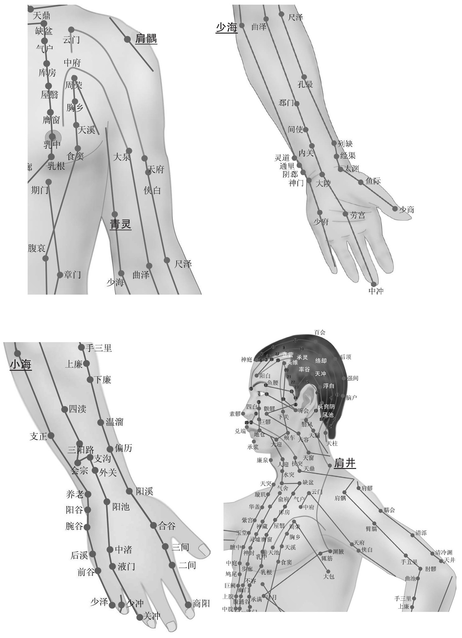 6.拿拨青灵穴。用一手的拇指、食指、中指,放在患侧青灵穴,对合用力,拿拨30~60秒,具有温经散寒、通络止痛的功效。