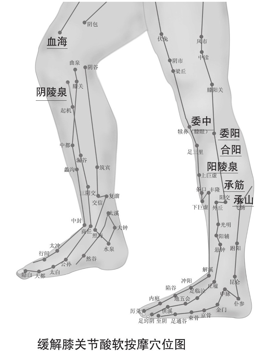 2.按摩患有膝关节酸软那条腿的血海、阳陵泉、阴陵泉、委中、委阳、合阳、承筋、承山等穴位。