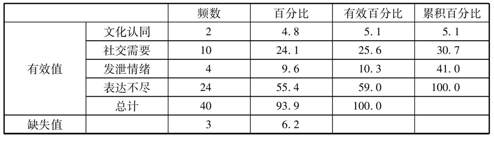 在中国留学,留学生的主要目的是学习汉语,按说应当多说汉语,少说母语,但是我们看到留学生使用母语的时间仍多于汉语,那么他们为什么频繁地使用母语呢?从表2-2可以看出,选择文化认同的有2人,占4.8%;选择社交需要的10人,占24.1%;选择发泄情绪的有4人,占9.6%;选择无法用汉语准确地表情达意的有24人,占55.4%。由此我们可以看出,社交需要和留学生汉语水平较低,无法运用汉语准确表情达意是留学生在中国留学期间经常使用母语的主要原因。对此,我们应当理解,因为人是社会的人,人需要交往,需要互相交流思想,否则就会严重影响人的身体和心理的健康成长。只要留学生能够认识到说汉语的重要性,合理地分配汉语和母语使用的时间就行,至于多少为合理,还需要进一步研究。牧之筠(2008)对“美国联合大学项目(ACC)”,“杜克大学在华项目(Duke Study in China)”以及“普林斯顿在北京(PIB:Princeton in Beijing)”三个项目“语言誓约”执行情况进行了调查,发现只有5.17%的留学生声称从来没有违反过语言誓约,在中国留学期间只讲中文,而72.99%的留学生承认偶尔违反,18.39%的留学生承认经常违反,4.6%的留学生承认总是违反。然后对留学生使用母语的原因进行了分析,最后指出,让留学生在项目实行期间“只讲中文”是不可能的,也是不切实际的。