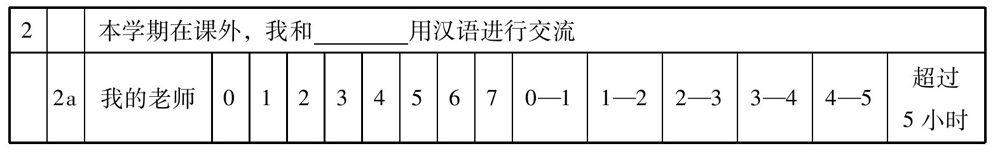 我们在这里使用的量表是将Freed, Dewey, Segalowitz&Halter(2004)使用的“后期语言接触版本”(Posttest version of the language contact profile)进行修正后用以测量留学生在课外汉语接触的情况。我们之所以使用该量表,一是因为Freed他们是国际上学生课外语言使用调查研究的领军人物,并且他们多次把该量表用于自己的研究;二是使用该量表可以把我们的研究结果与使用量表的其他人的研究结果进行对比;三是该量表已经进行了无数次测量,证明是有效的。我们对量表进行了修正,一是因为原来的量表是用来测量美国学生在西班牙课外语言接触情况的,我们把它修正为测量留学生在中国课外汉语接触情况;二是该量表的前测部分主要用来测量二语学习者在本国的目的语课外语言接触情况,由于我们研究的重点是留学生在我国的课外语言接触情况,所以把这部分内容省略了;三是对第二部分运用汉语交谈对象的2f进行了改动,原来的问卷调查对象是服务人员,因为我们在实际教学和与学生接触中发现,大多留学生有语言伙伴,并且与语言伙伴交流频繁,所以我们把它改为“语言伙伴/老师”。