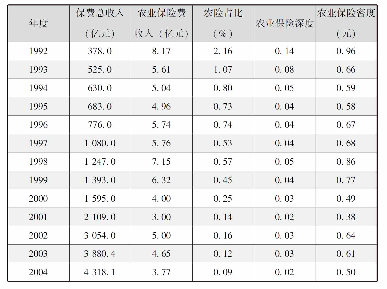 表3 1992—2004年我国农业保险业务情况统计表