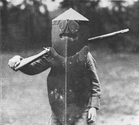 美军正式在小范围内列装的是一种布鲁斯特单兵护具(Brewster Body Shield)。其材质为含有铬镍成分的合金钢,据称可以承受住射速为820米/秒的刘易斯机枪子弹;不过其最大的缺陷是沉重笨拙,整套盔甲包括一个标准中世纪造型的头盔(或者说是头套),总重量达到18千克。个人认为,其穿戴起来可能会给人留下“三K党党徒”的不良印象。