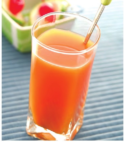 2.将柳橙和苹果放入榨汁机中,再加入葡萄柚汁搅打成汁。