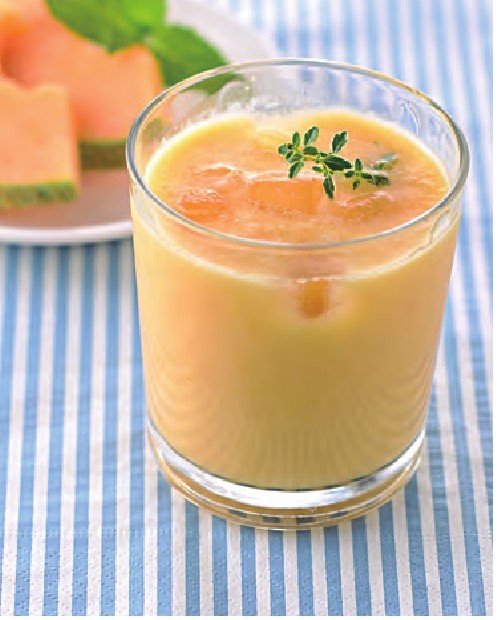 2.将芒果、哈密瓜放入榨汁机内,加入牛奶搅打成汁即可。