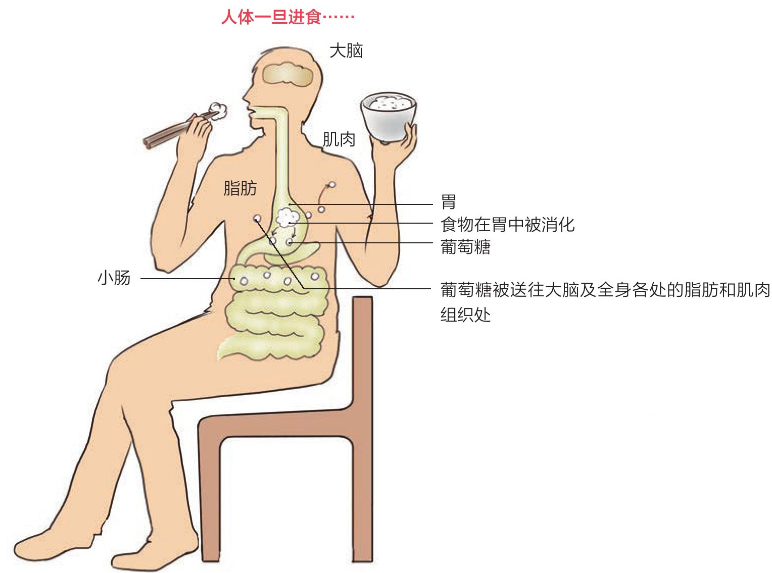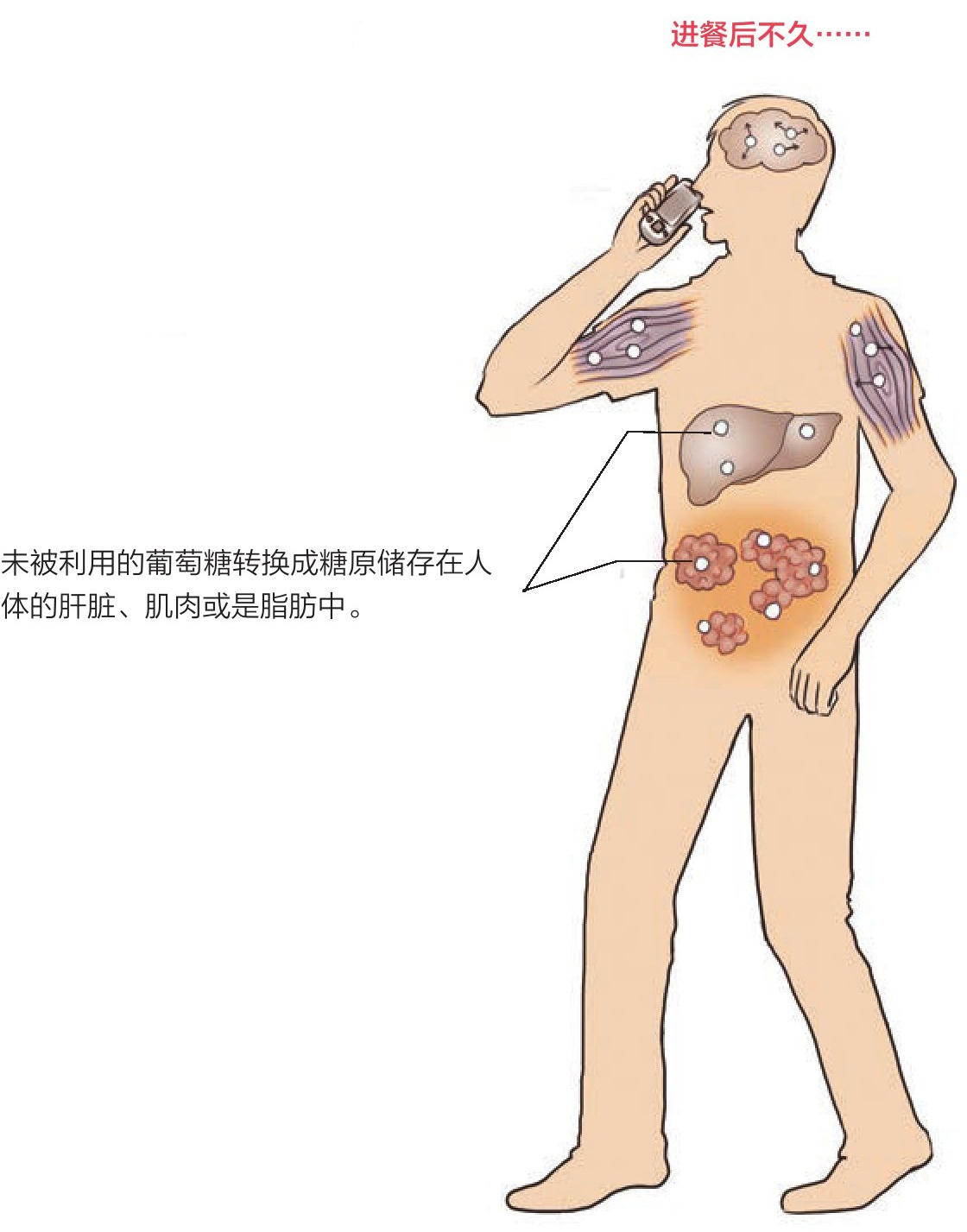 碳水化合物主要存在于米饭、面包、水果中,经唾液①、胃液②、肠液③消化,大部分会被分解为葡萄糖。它们在肠胃中被吸收,在经过肝脏之后,又被输送到血液中。因此,每当饭后,血糖都会有小幅度的升高。
