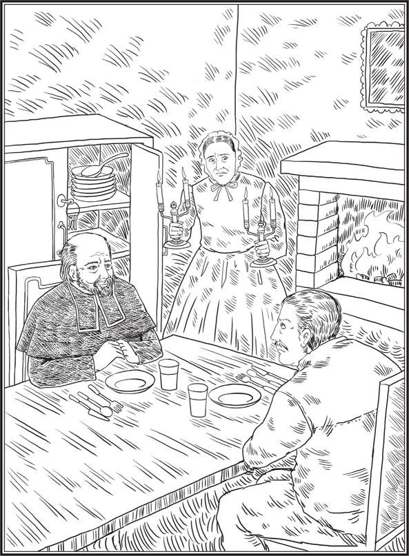 这天晚上8点钟,米里哀主教还在工作。当马格洛大娘从壁橱里取出银餐具时,他才来到餐桌旁准备吃晚餐。