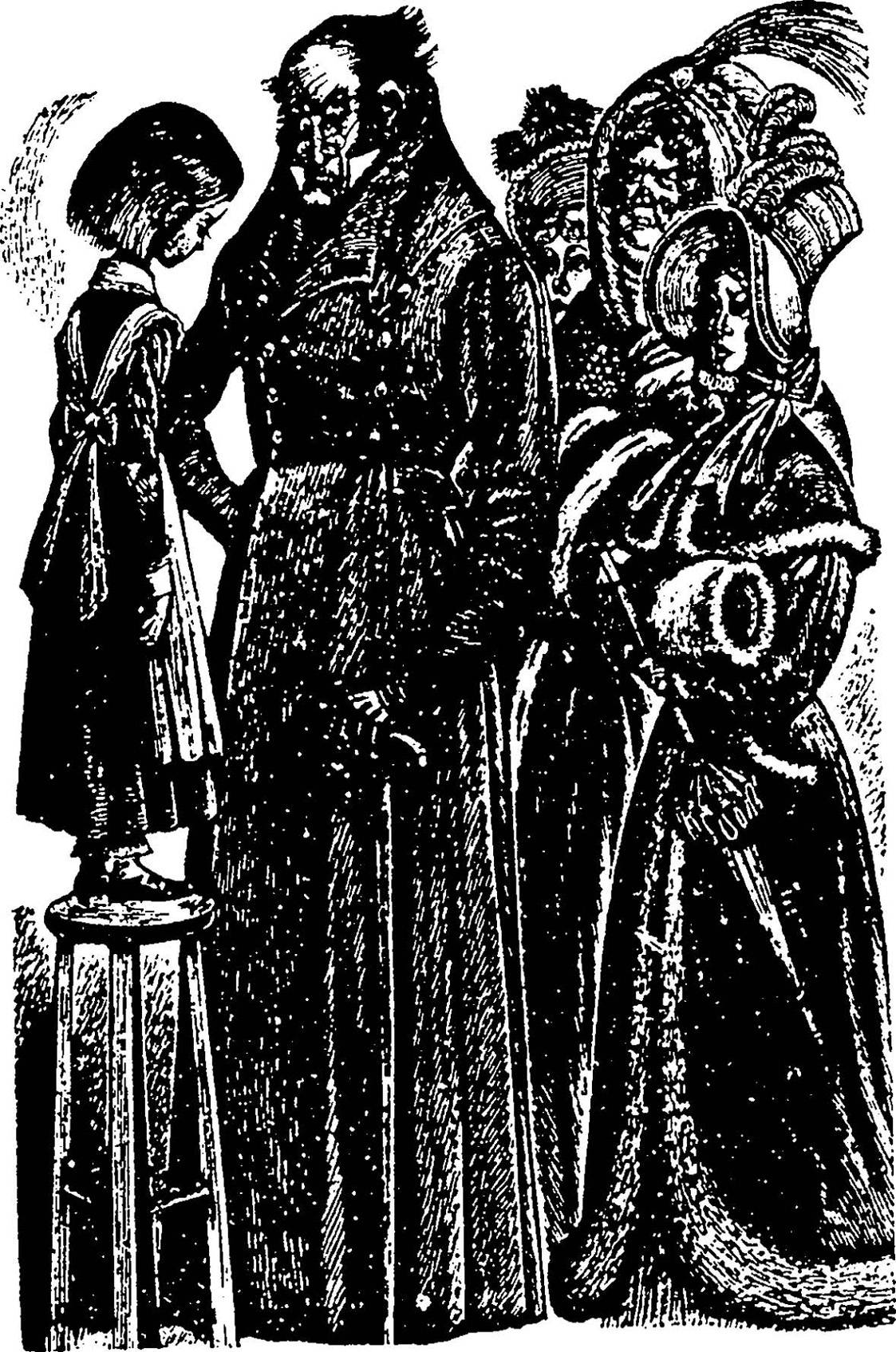 正说到这儿,勃洛克赫斯特先生的话给打断了,又有三位来访者,都是女客人,这时走进了教室。她们真该稍微早来一点才好,那样就能听到他关于衣着的这番训话了,因为她们正好满身丝绒、绸缎、皮毛,打扮得十分华丽。三人中两位年轻的(十六七岁的漂亮姑娘)头戴着当时时新的水獭皮帽,上面还插着鸵鸟毛,在这雅致的头饰的边檐下面,密密地垂着卷得十分精致的轻盈鬈发。上年纪的那位太太裹着一条镶有貂皮边的贵重丝绒披巾,前额还垂着法国假鬈发。