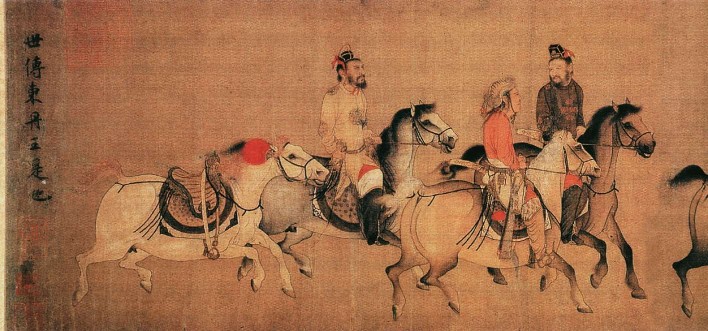 辽东丹王耶律倍自投后唐明宗后,长期居住中原,其画风对后世影响很大。从文献著录来看,此卷是耶律倍所画的一件精品。人物形象似胡人,各具姿态,衣冠、服饰、佩戴亦各有不同;马匹矫健、丰肥;东丹王神情忧郁,若有所思,正合其弃辽投唐后的处境。