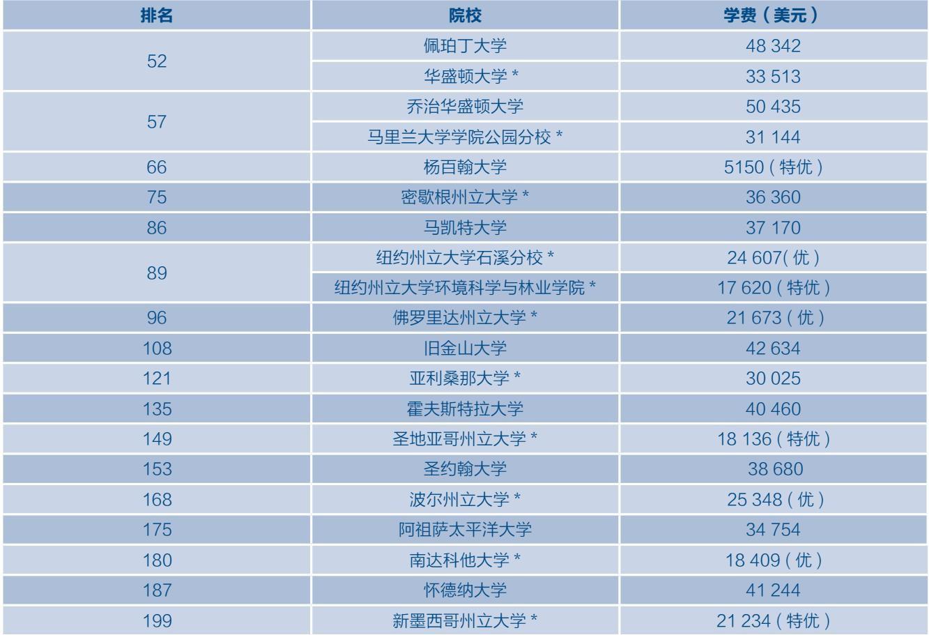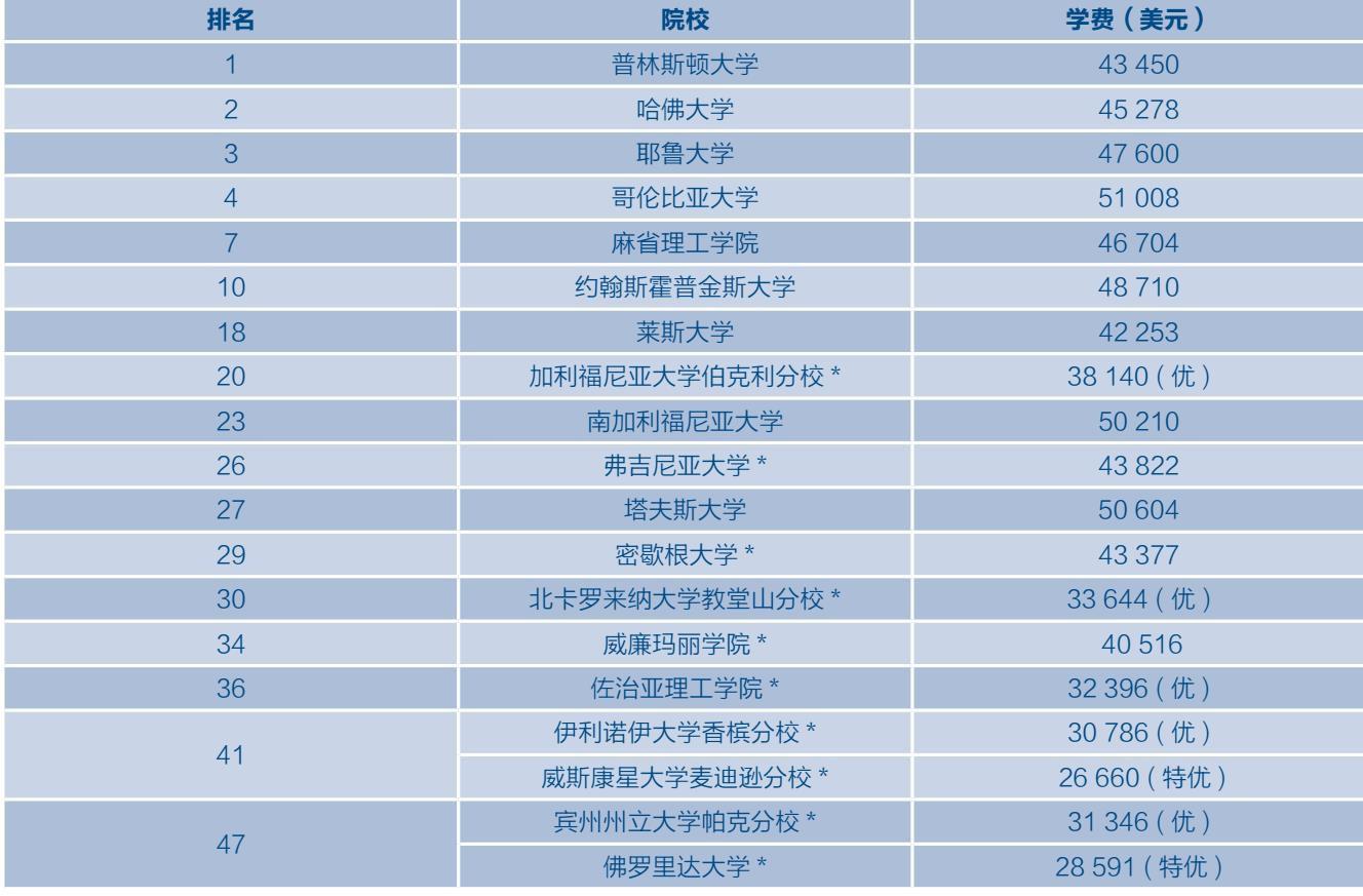下面列举部分美国公、私立大学本科学费如下(标*者为公立大学)。