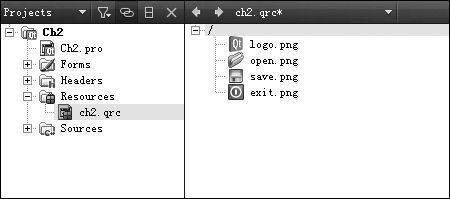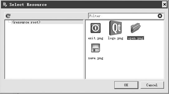 (1)打开资源文件,参照2.1.3节步骤添加一些图标,这些图标在后面的菜单项设计中使用,如图2-10所示。