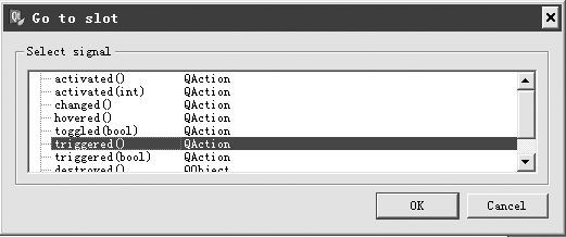(7)在动作编辑面板中选择其中一个动作后右击,在弹出的快捷菜单中选择go to slot命令,在出现的对话框中,选择triggered()信号(见图2-16),Qt Designer自动在MainWindow的头文件和源文件中添加该信号的响应操作。