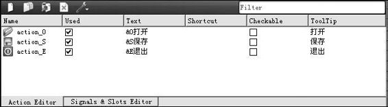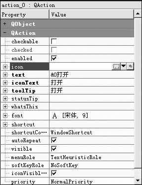 (6)在添加菜单项时,在动作编辑面板中,同时定义了与菜单项对应的动作,实际上Qt对菜单项的定义就是动作,如图2-15所示。