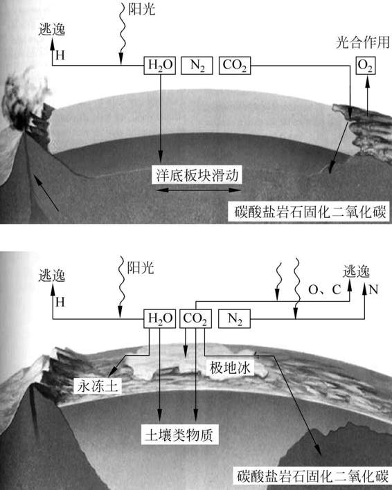 ◎图2.2 地球和火星大气演变的简单示意图。上图为地球,大气层、海洋、陆地(植被)构成了一个有效的二氧化碳与氧气的循环,这样的地球大气是有生命的、活动的。下图为火星,火星的质量小,相对分子质量小的气体多数逃逸了,也由于没有板块作用,使得二氧化碳、氧气、水之间不能产生有效的循环