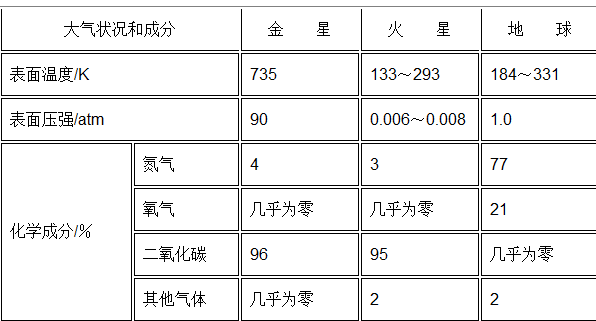 发生于40亿年前的小天体撞击产生了地球的原始大气,而那一时期的撞击并不只是针对地球的,火星、金星、月球都被撞击形成火山喷发,也形成了它们各自的大气。月球因为质量和体积都太小,无法吸引大气存留,所以至今还是没有大气层。而火星和金星最早形成的大气,由于都来源于火山喷发,所以起初的大气成分,三者是基本相同的(见表2.1)。那么,是什么因素造成了目前三者之间的巨大差异呢?对这一问题的清楚的认识,很有助于我们对地球、地球大气演变的深入了解。