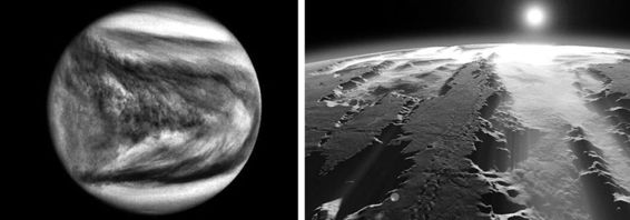 ◎图2.1 厚重的金星大气(左)使我们根本看不到它的本来面目;而火星(右)稀少的大气层甚至都无法造成地球大气所具有的“晨昏现象”