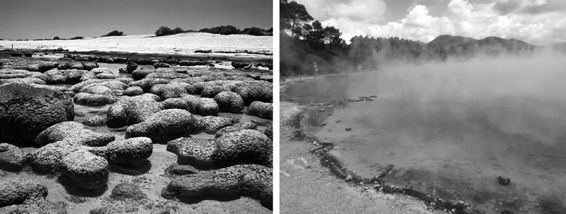 提到澳大利亚你可能就会想到“大堡礁”的地质奇观。实际上,在澳大利亚一个叫“鲨鱼湾”的地方,有着不仅是地质奇观,也是生物学、地球学奇观的存在——叠层石。而和澳大利亚相邻的新西兰,则现存有许多的火山岩溶水池,那里生活着让全世界科学家都震惊的生物(见图2.3)。