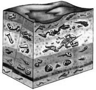 ◎图1.18 地壳中的岩石是按照它们形成的先后顺序叠加在一起的,越在上层的时间离我们越近,埋藏在岩石中的化石就是那个年代的生物代表