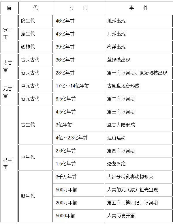 前面的讨论,许多内容涉及了时间,而且是长周期的时间。而这样的讨论,我们一般是以地质年代来叙述的。地质年代,不懂的人会说那是地质学家的事情。稍许懂一些的人会说,地质年代图(表)里的什么“宙、代、纪、世、期、时;宇、界、系、统、阶、带”很让人觉得麻烦。但是,为了认识和彻底了解我们地球的演化,地质年代是我们必须使用而且也很容易使用的一种得力的“工具”。