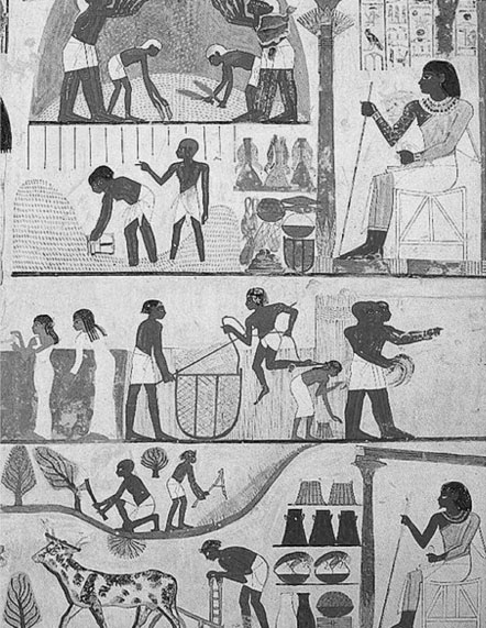 在有文字记载的历史以前,为了找到填饱肚子的食物,人类往往要花费九牛二虎之力,每天要用16个小时来找吃的。埃及的农民和城市居民就不用这么辛苦,他们有许多闲暇时光,可以做点艺术品之类的。