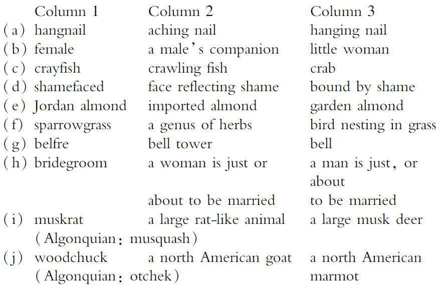 2)How do the words in column C differ from those in columns A and B?