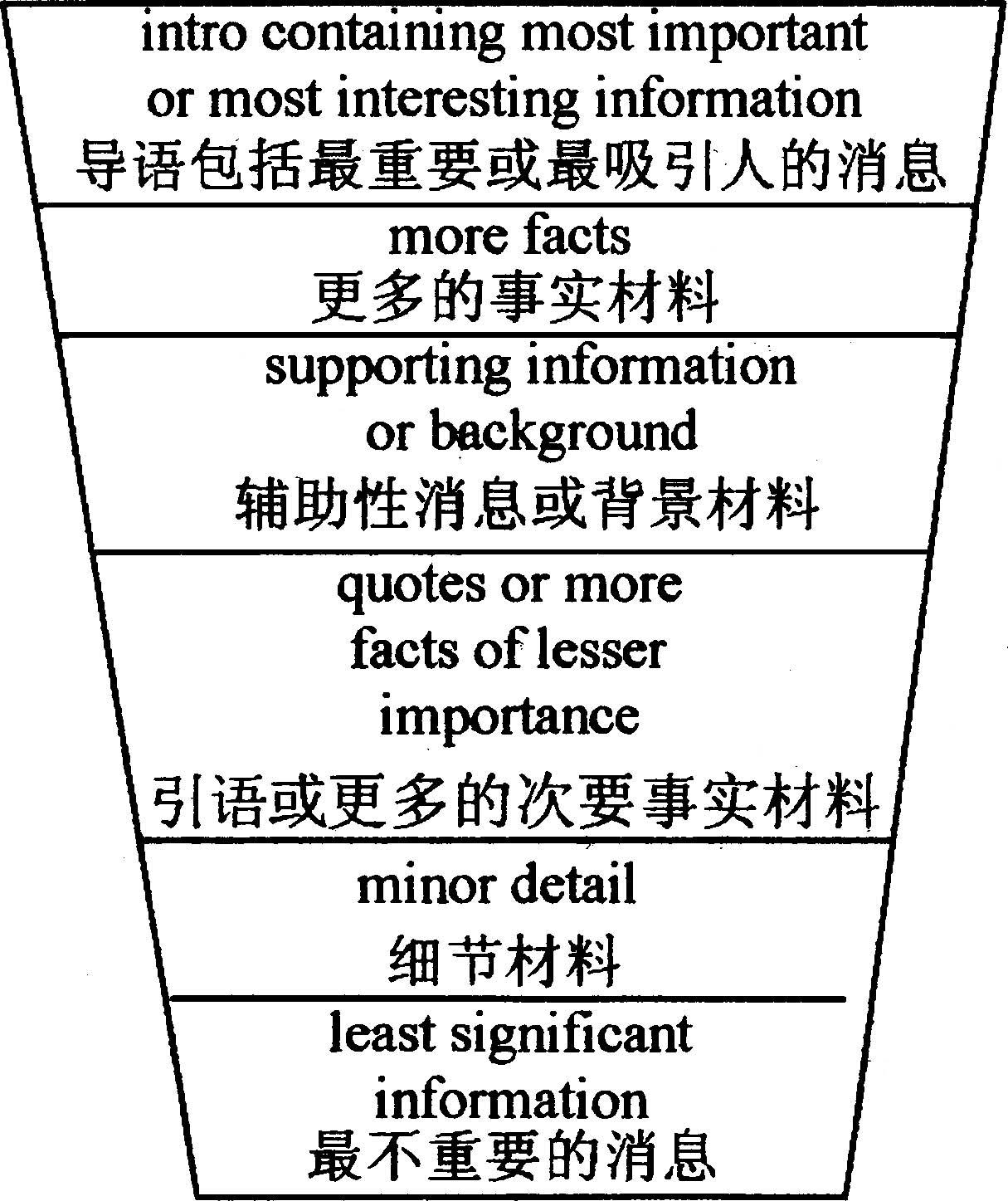 在诸多导语中以倒金字塔式结构导语最为典型。五个W和一个H是构成一则完整的消息不可缺少的要素。以往直接的消息报道或纯消息一般采取“倒金字塔形式”,其特点是将新闻报道最重要的五个W和一个H按重要性的顺序来用倒叙式头重脚轻地安排,把新闻的高潮和结论放在最前面的导语里,然后按事实的重要性递减的顺序来安排(in the order of descending importance),由此突出最重要、最新的事实。为帮助读者了解这种倒金字塔式结构,见下列西方新闻学著作中的图表说明: