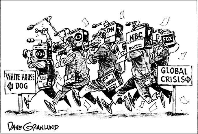 2009年4月美国《基督教科学箴言报》又刊载了一幅漫画,讽刺美国著名大电视台偏爱白宫奥巴马家宠物狗(White House Dog),胜过“全球经济危机”(Global Crisis):