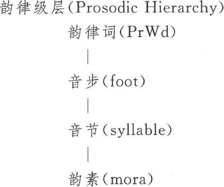 )是从韵律学的角度来规定“词”的概念。一般最流行的“词”的定义是从句法学的角度把词确定为“最小的能够自由运用的语言单位”。“韵律词”是从韵律学的角度来定义“最小的能够自由运用的语言单位”。韵律学中的“语言单位”是“韵律单位”,因此韵律词以语言中的韵律单位为基础。本章主要根据McCarthy和Prince(1993)“韵律构词学”(prosodic morphology)理论来探讨汉语的韵律词,主张人类语言中“最小的能够自由运用的韵律单位”是“音步”(foot)“韵律词”的定义通过韵律构词学中的单位“音步”来确定,而“音步”则通过比它小的单位“音节”(syllable)来确定。韵律构词学的理论以“韵律级层”为基础: