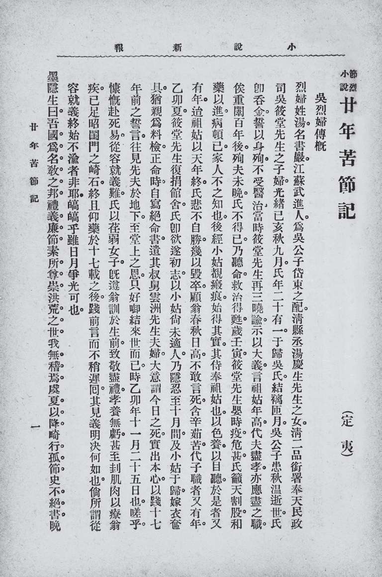 对女性节烈充满赞赏、态度最鲜明的当数李定夷。李定夷最著名的“节烈小说”是连载于1916年《小说新报》第1—12期上的《廿年苦节记》。小说叙述了江苏武进一位叫汤书岩的大家闺秀出嫁仅两个月丈夫就病死了。书岩痛不欲生,欲吞金殉夫,后被救起。她的家翁(公公)这样劝她:“祖姑年高,代夫尽孝,亦应尽之职,俟重闱百年后,殉夫未晚。”于是书岩尽心服侍祖姑、家翁,在家翁病危时更是割股疗亲。祖姑、家翁相继去世后,又抚养小姑直至她出嫁。完成了这些事情以后,她已经守节十七年了。她自杀身亡,绝命书中写道:“今日之死,实出本心,以不负十七年前之誓言。”对于创作这样一部小说,作者在小说《弁言》中说:“晚近数十年间欧风美雨侵入华夏,自由之说行,重婚不为羞;平等之说行,伦常可泯灭。圣人云:邪说横行,甚于洪水,吾为此惧。端居之暇,思小说家言,以振末俗。”小说完成的是一个言行一致的守节寡妇的标准形象。为了扩大小说的影响力,小说出版前后所做的广告都强调“是书所纪纯系实事,书中主人公姓汤名书岩,前清奉天民政使司吴筱堂之子妇也”,力图告诉读者,这是真人真事,此人此事值得推崇。