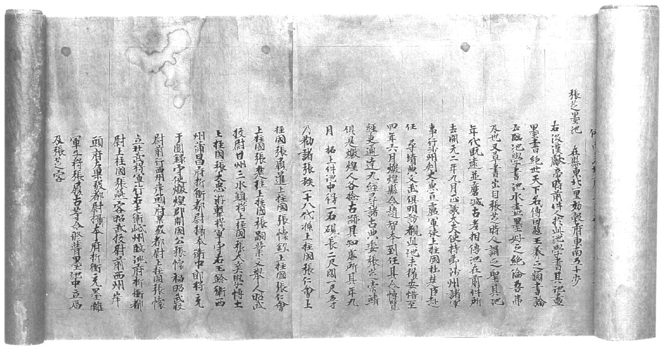 ,并发汉兵三万人镇守,大大增强了唐朝在西域的战斗力。从此以后,直到8世纪末的一百年间,安西四镇的建制没有再动摇,西域基本在唐朝统治之下。在唐朝用兵西域和镇守西域的过程中,不少沙州将士奔赴前线。《沙州都督府图经》卷三“张芝墨池”条(图3),记有开元二年(714)任“游击将军、守右玉钤卫西州蒲昌府折冲都尉、摄本卫中郎将、充于阗录(镇)守使、敦煌郡开国公”的张怀福