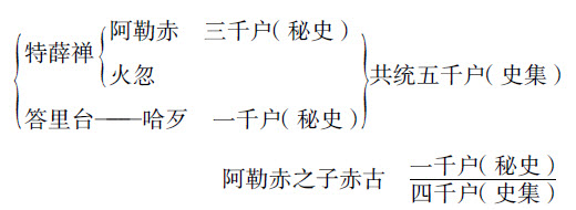 《元史》卷120《术赤台传》称:“朔方既定,举六十五人为千夫长”。《元朝秘史》第202节则在开列了很长一串千户那颜的名单后说,除林木中百姓,“达达百姓的千户的官人每,太祖皇帝的提名来的九十五千的官人每做了”。秘史开列的名单,按正确的读法,共有八十八人。其中阿勒赤驸马、孛秃驸马及阿剌忽思的吉忽里驸马分别辖有翁吉剌三千户、亦乞列思二千户、雍古惕五千户,以组编之千户计之,适足九十五之数。