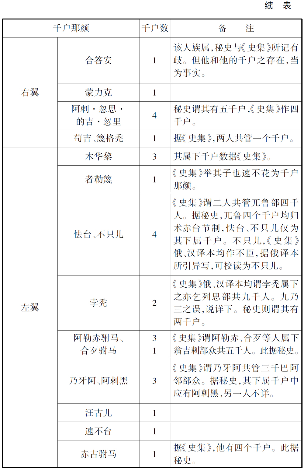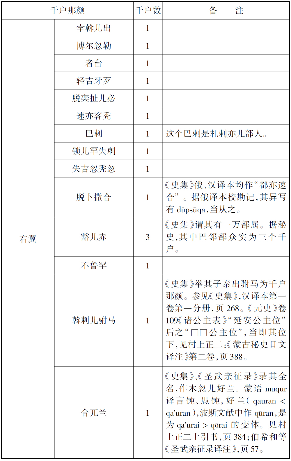 在这个名单里,最后还应加上一个秘史第202节未曾著录的名字,即拉施都丁的一百二十九千户表中左翼军札剌亦儿台也速儿千户。这个人,无疑就是《元史》卷95《食货志》“岁赐”条所记“左手九千户”中的也速兀儿千户。丙申年分封时,他与也速不花(兀良哈惕部)等人受同等待遇,应当也是在建国时与也速不花父亲者勒篾同时受封为千户那颜的。