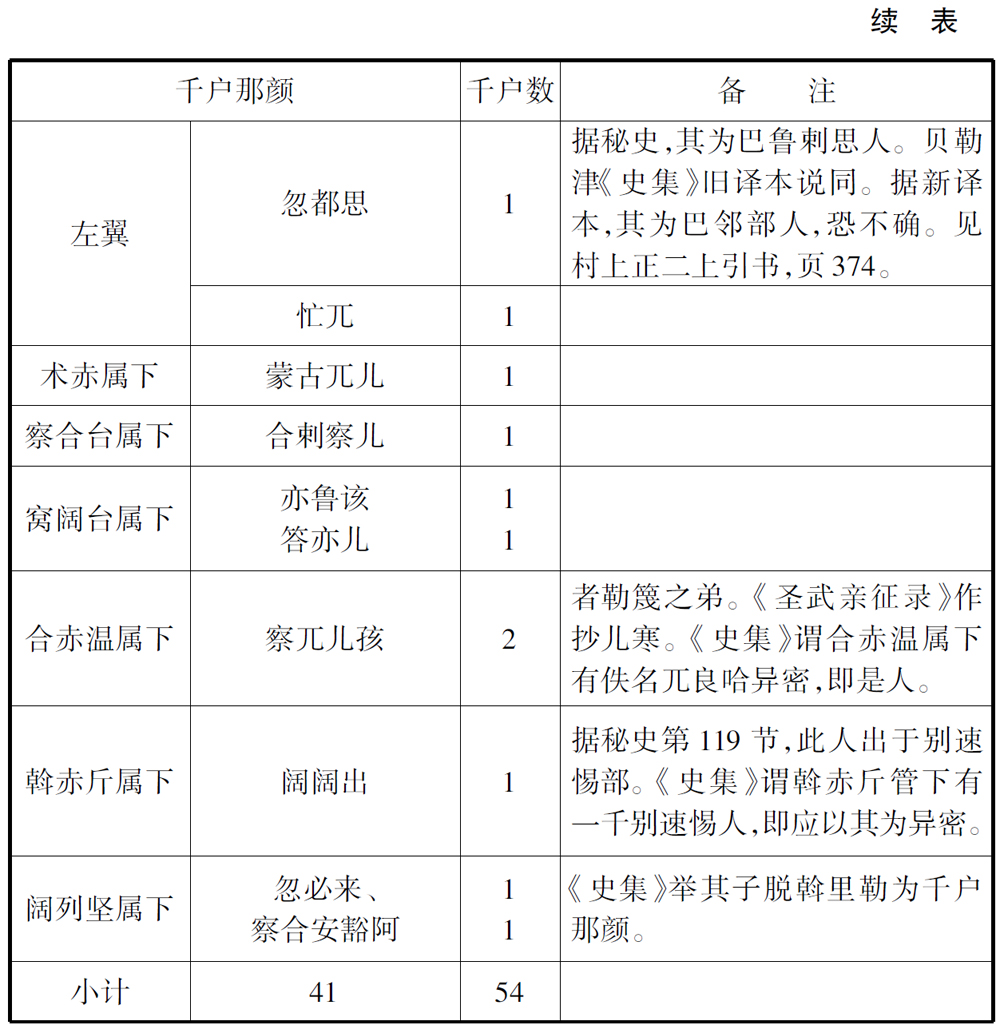 上述讨论似可说明,豁儿赤的十个千户内,确切知道应属于1206年序列的,只有三个千户,或者最多也只有五个千户。应当进一步从1206年序列中排除的,似乎更可能是豁儿赤属下的五至七个千户,而不是斡歌列、阿儿孩合撤儿诸千户。