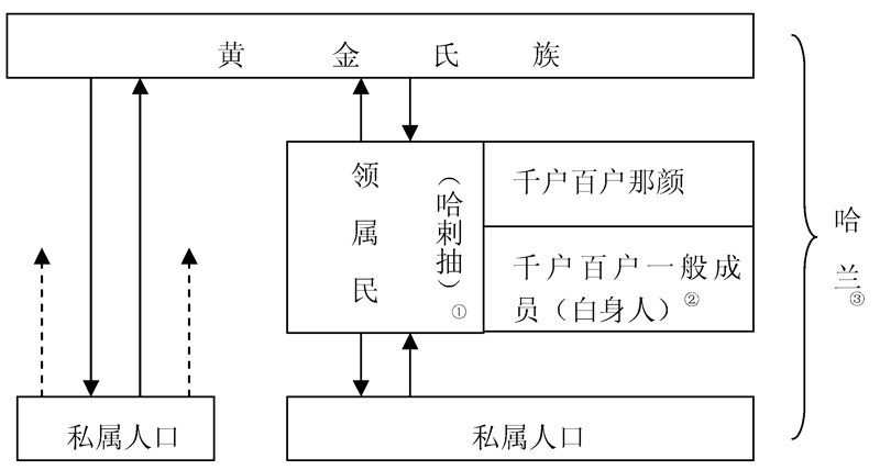 现在可以回到千户百户历史地位的问题上去了。迄于成吉思汗兴起时代前后,存在于蒙古社会的斡孛黑与阿亦马黑之中的那种普遍而湮远的共同血统观念,虽然业已渐趋疏弛,但还不能说已然瓦解了。13世纪初叶蒙古游牧民的主体,仍处在日益松散变质的氏族组织的形式下。只是当成吉思汗的政权确立之时,在千户百户组织取代原先的斡孛黑与阿亦马黑后,这一形势才真正发生整体性的演变。不论是原来的氏族显贵或者普通平民,全都以黄金氏族领属民的身份被编入千户百户之中。由于中世纪游牧经济的限制,千户百户组织很难说是一种按照地缘关系,或曰人—地结合的关系来划分人民的制度;它是按游牧群集来划分人民的。一部分游牧群集,由原来属于不同氏族或部落的人口组成。但是也有一部分游牧群集,仍由原来处在同一氏族组织之下的成员们所构成。虽然如此,实际社会关系长期被纳入氏族、部落组织形式的状况,现在从根本上得到了转变。如果我们承认社会组织基本单元的构成形式对于实际社会关系具有某种反制约、反作用,那就应当看到,千户百户制度的采纳,是如何有利于极大地促进新划分的游牧群集中那种不同于原生血缘观念制约下的人—人关系,进一步地发展起来。这在千户百户组织里成为一种既定的、越来越占主导地位的趋势。人们的族属与他们所在的社会的和军事行政的组织,也就逐渐成了两回事。