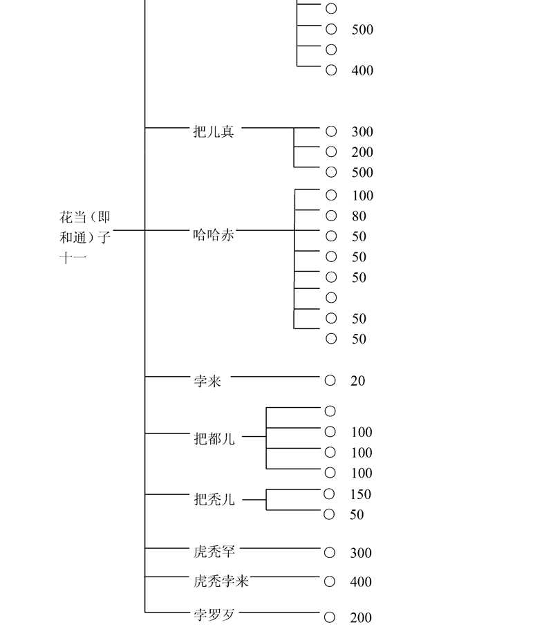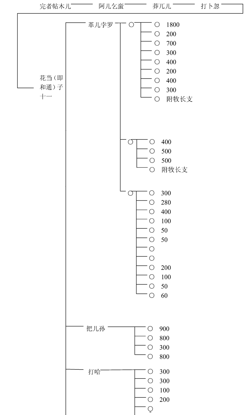者卜客既为合撒儿的千户那颜,他就不可能属于被同时列入一百二十九千户序列中的木华黎所统札剌亦儿三个千户之内。所以此处不存在重复计算问题。者卜客的情况,与孔温窟哇另一个弟弟赤剌温恺赤之子秃格有所不同。秃格的儿子不吉歹与者勒篾之子也孙帖额共同管理怯薛中的四百名豁儿赤(qorchi)