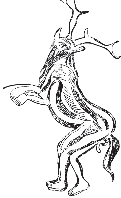 拉斯科洞穴还有一些“荒谬的东西”。比如,构图混乱,动物的形象重重叠叠,有的动物的轮廓线要画好几次。还有一些奇形怪状的人物,头戴兽冠,身披兽皮,头上有鹿角,身后有狼尾,耳朵似猫,下颌有浓重的长须,而躯干、腿和生殖器是人类的。这种巫师的形象被布吕叶称为“特洛瓦·费莱尔神”。