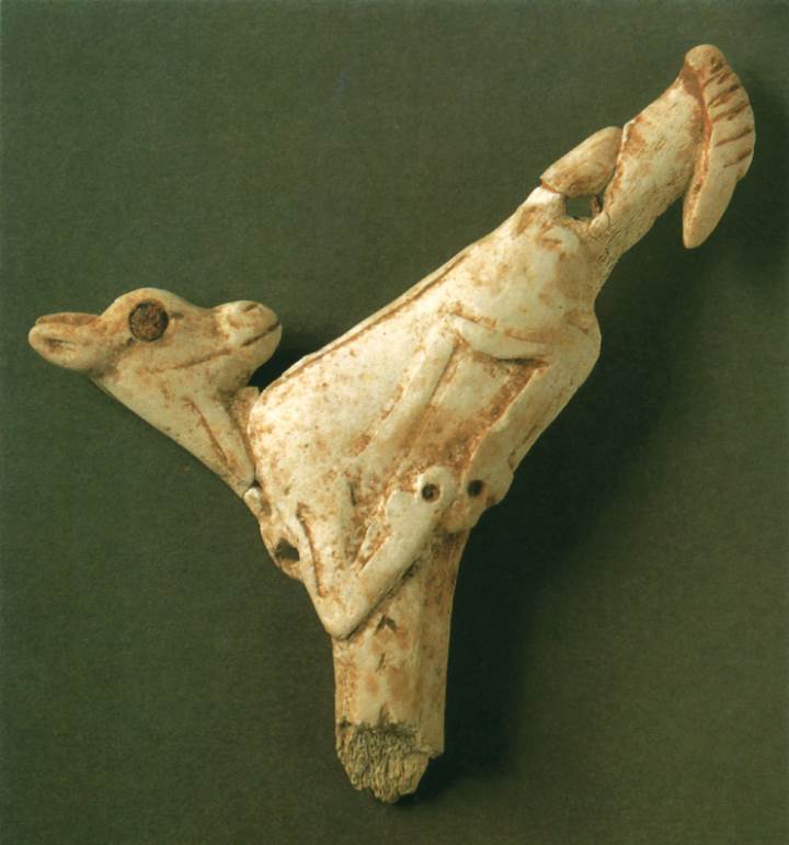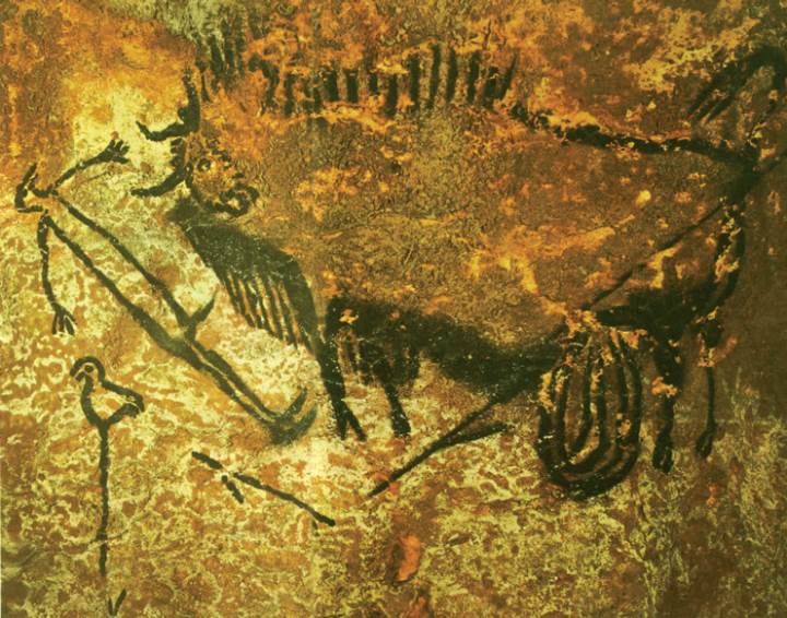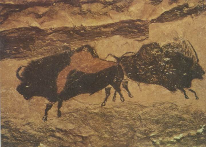 史前艺术不是这样的。在史前的社会生活中,人的力量是渺小的,而动物的力量是强大的。因此,在史前艺术的题材中,人不是主要的,动物才是主要的。在原始宗教中,神不是人而是动物。哲学家说,人是按照自己的面貌创造神的面貌。这句话不全对。在动物比人强大时,人是按动物的面貌创造神的面貌。只有在人比动物强大时,人才按自己的面貌创造神的面貌。史前艺术如实地反映了动物的强大和人的渺小。在拉斯科洞穴有一幅壁画《野牛和人》,鸟头人(化装成动物的猎人)几乎被野牛顶倒了。那头野牛已经受伤,肠子都流出来了,但是,它仍比人强大得多。史前人的心理是矛盾的。他们既希望野兽强大,以便获得更多的食物;另一方面,他们又害怕野兽的强大,害怕受到野兽的伤害。原始人关心动物甚于关心人,因此,相对于栩栩如生的动物形象,对人的形象的描绘显得拙劣和粗糙。