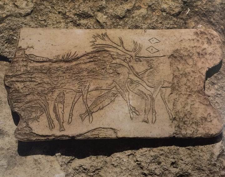 《渡河的鹿》,这是在法国比利牛斯山发现的骨雕。画面很生动有趣,一群被追逐的鹿被迫渡河,一头雄鹿在警惕地看着后面追来的人或动物。史前人不会在绘画中表现水,就在鹿的角上面画上几条大鱼,表示鹿在河中。骨雕也许具有认识作用,史前人告诉同伴,当鹿在渡河时,是最容易捕获它的时候。